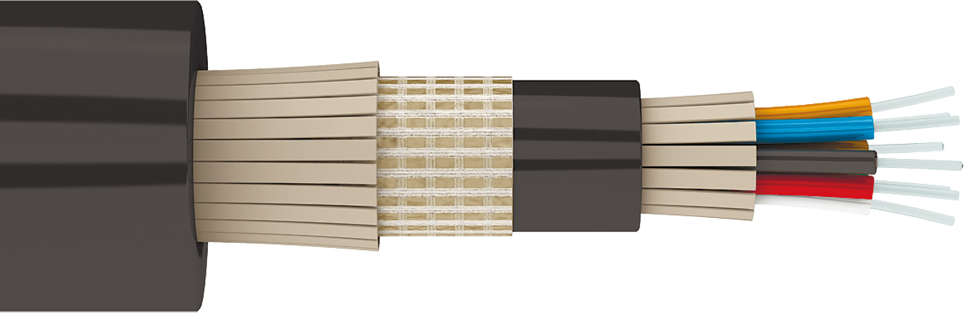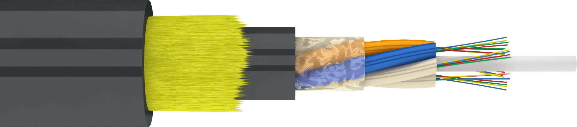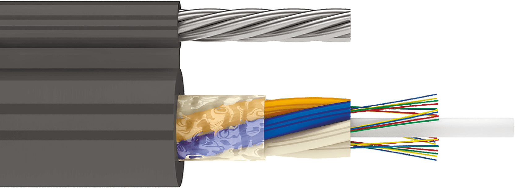 Свободный доступ к волокну в любой точке кабеля, не распространяет горение, стойкий к УФ-излучениям.